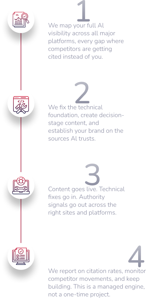 We structure your site so Al systems can read, understand, and cite it. Schema markup, entity optimization, content architecture, the technical foundation everything else depends on.